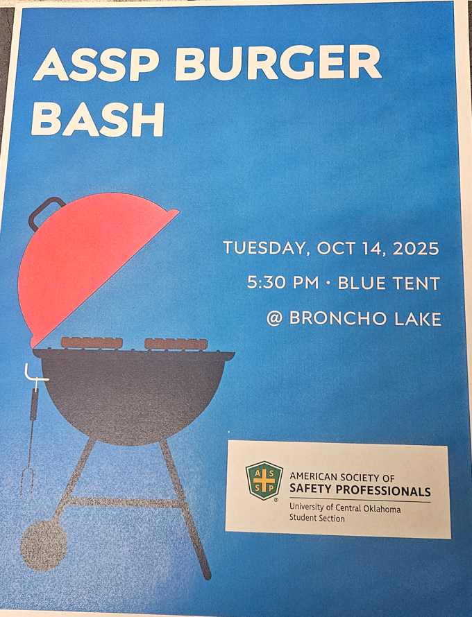Come one and come all to the UCO Fall Burger Bash. Come to Bronco Lake around 5:30 pm on Tuesday, October 14th and enjoy burgers with all the fixins. Everyone is invited. Come and meet the UCO Industrial Safety students. This is a free dinner for all ASSP members.