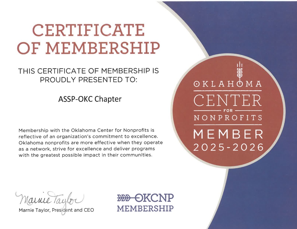 The Oklahoma City ASSP Chapter is proud to be a Member of the Oklahoma Center for Nonprofits. This organization provides many services to a wide variety of Nonprofit groups throughout the Oklahoma City Metro Area.